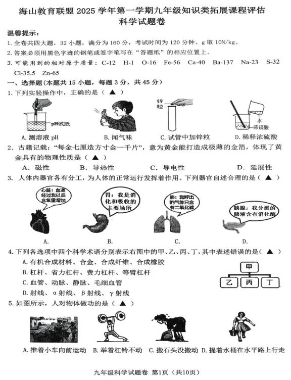 浙江省海山教育联盟2025学年第一学期九年级知识类拓展课程评估 科学试题卷(扫描PDF版,含答案 全册)