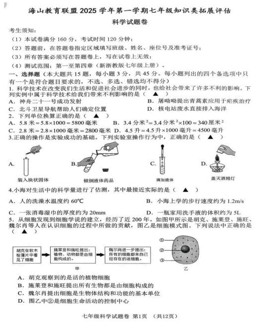 浙江省海山教育联盟2025学年第一学期七年级知识类拓展评估 科学试题卷(扫描PDF版,无答案 1-4章)