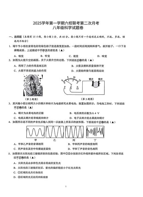 浙江省温州市2025学年第一学期六校联考第二次月考 八年级科学试题卷(扫描版,含答案 1-4章)
