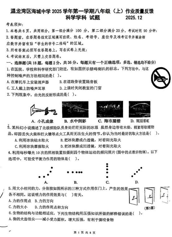 浙江省温州市龙湾区海城中学2025学年第一学期八年级(上)作业质量反馈 科学学科试题(扫描PDF版,无答案 1-3章)