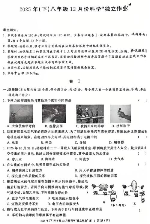 浙江省嘉兴清华附中嘉兴实验学校2025年(下)八年级12月份科学“独立作业”(扫描PDF版,无答案 1-4章)