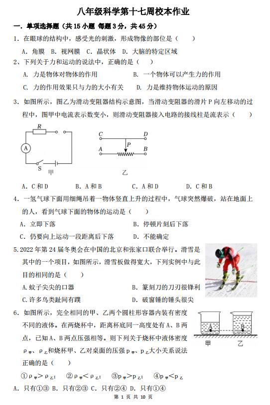 B. 篆刻刀的刀刃很锋利 D. 破窗锤的锤头很尖 | 6. 如图所示, 完全相同的甲、 乙两个圆柱形容器内装有密度 不同的液体。 在两烧杯中, 距离杯底同一高度处有 A、 B 两 点, 已知 A、 B 两点压强相等。 则下列关于烧杯中液体密度 ρ 甲、 ρ 乙和烧杯甲、 乙对桌面的压强 p 甲、 p 乙大小关系说法 正确的是( ) ①ρ 甲>ρ 乙; ②ρ 甲<ρ 乙; ③p 甲>p 乙; ④p 甲<p 乙 A. 只有①③ B. 只有②③ C. 只有②④ D. 只有①④