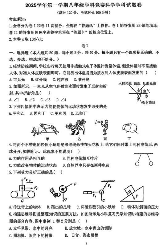 浙江省宁波市余姚城区联考2025学年第一学期八年级学科竞赛科学学科试题卷(扫描PDF版,含答案 1-3章)