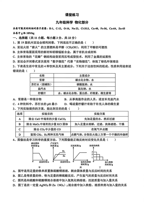 2025年12月杭州市公益中学九上科学月考卷试题(扫描附答案)