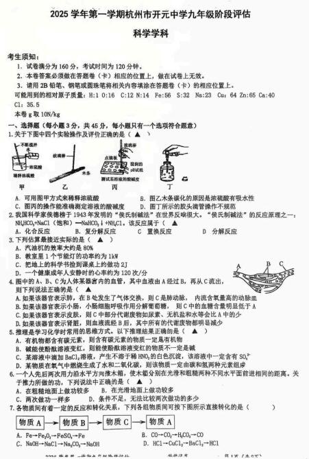 浙江省2025学年第一学期杭州市开元中学九年级阶段评估 科学学科(扫描PDF版,无答案 全册)