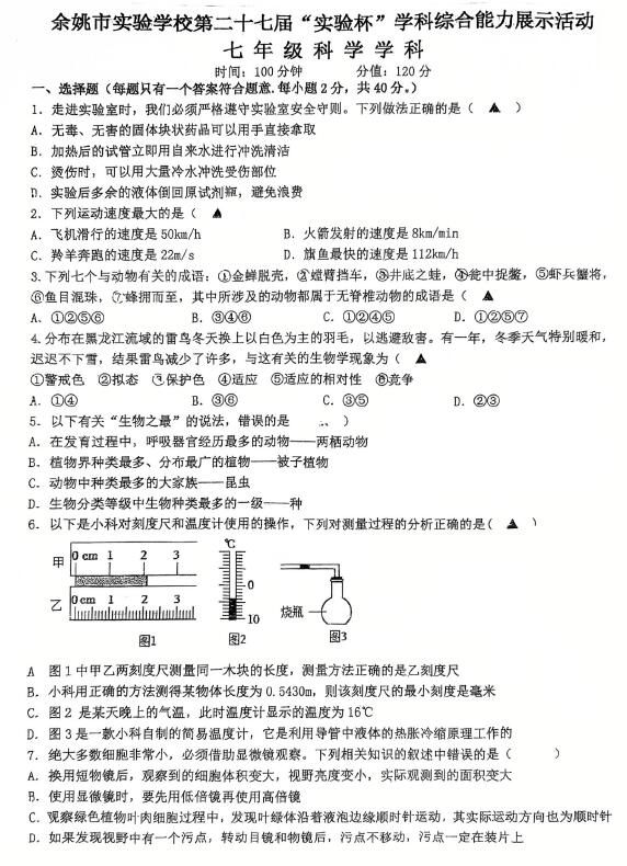 浙江省宁波市余姚市实验学校第二十七届“实验杯”学科综合能力展示活动 七年级科学学科(扫描PDF版,无答案)