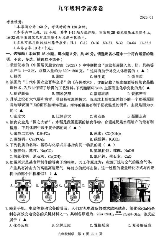 浙江省湖州市吴兴区2025学年第一学期九年级科学素养卷 2026.01(扫描PDF版,无答案)