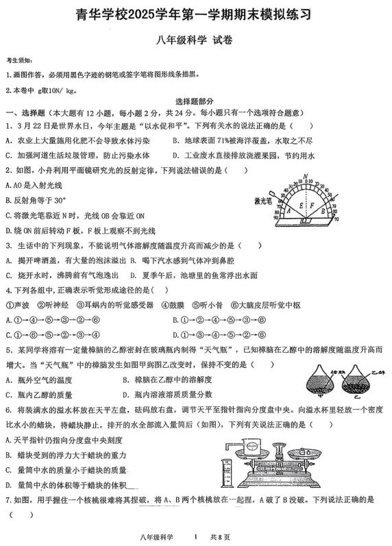 浙江省温州市苍南县龙港市青华学校2025学年第一学期期末模拟练习 八年级科学试卷(扫描PDF版,无答案)