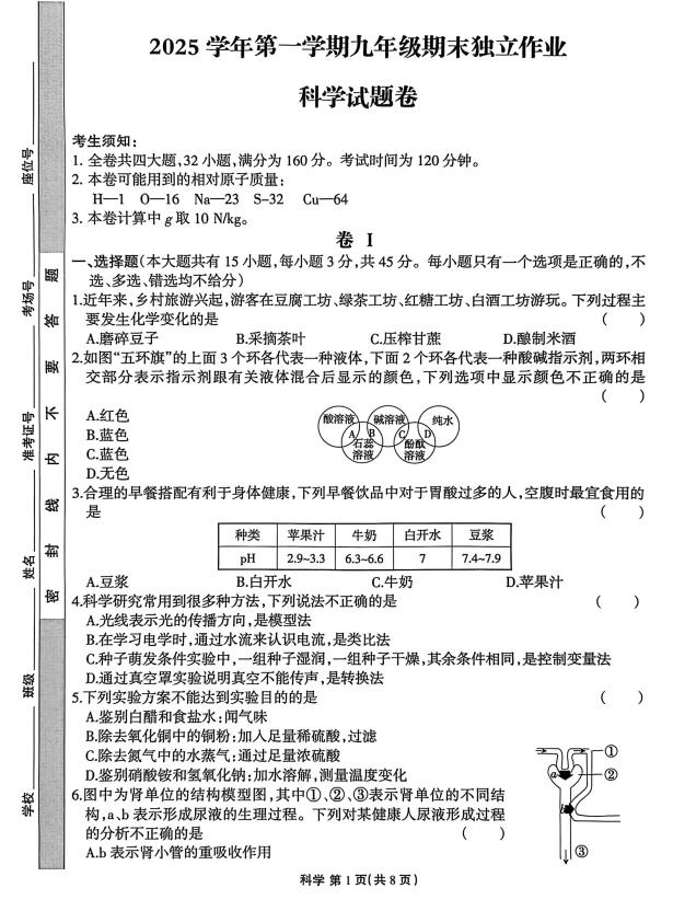 浙江省浙派联盟2025学年第一学期九年级期末独立作业 科学试题卷(扫描PDF版,无答案)