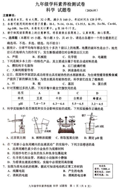 浙江省嘉兴市桐乡市2025学年第一学期九年级学科素养检测试卷 科学试题卷 (2026.01)(扫描PDF版,无答案)