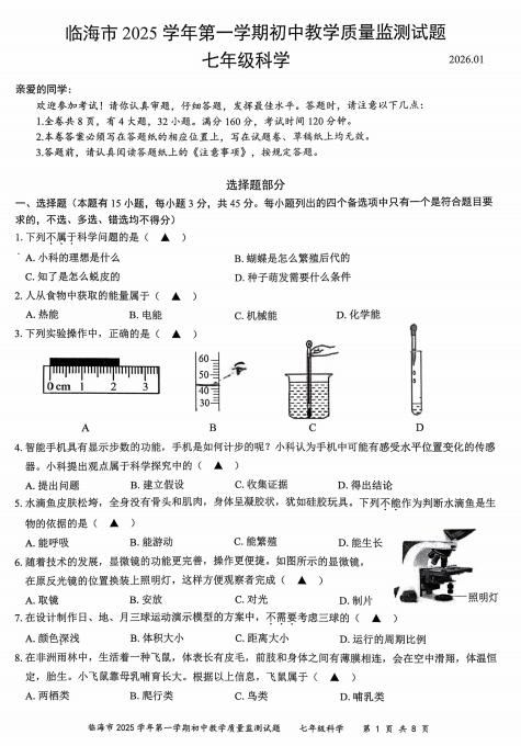 浙江省台州市临海市2025学年第一学期初中教学质量监测试题 七年级科学(扫描PDF版,含答案+答题卷)