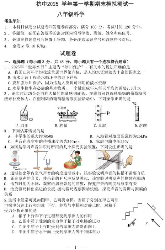浙江省杭州中学2025-2026学年八年级上学期科学期末模式卷(扫描pdf版,无答案)