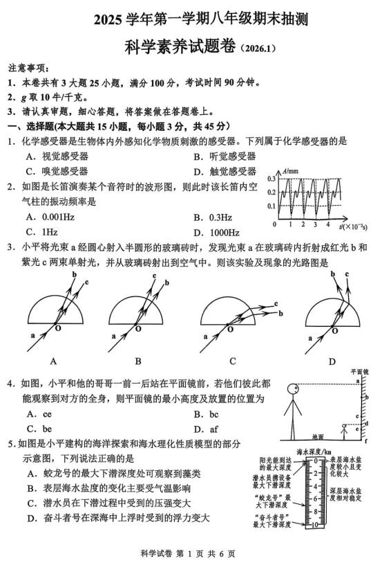 浙江省嘉兴市平湖市2025学年第一学期八年级期末抽测 科学素养试题卷(扫描PDF版,含答案)