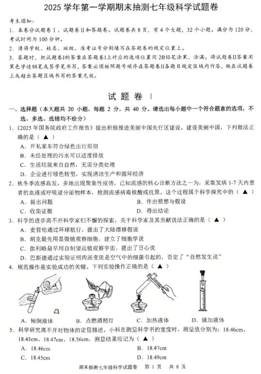 浙江省宁波市南三县2025学年第一学期期末抽测七年级科学试题卷(扫描PDF版,含答案)