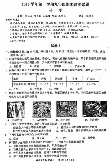 浙江省台州市温岭市2025学年第一学期九年级期末调测试题 科学(扫描PDF版,含答案)