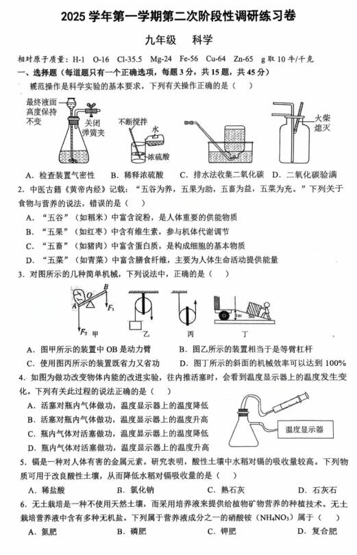 浙江省杭州市第十四中学附属学校2025学年第一学期第二次阶段性调研练习卷九年级科学(扫描pdf版,无答案)