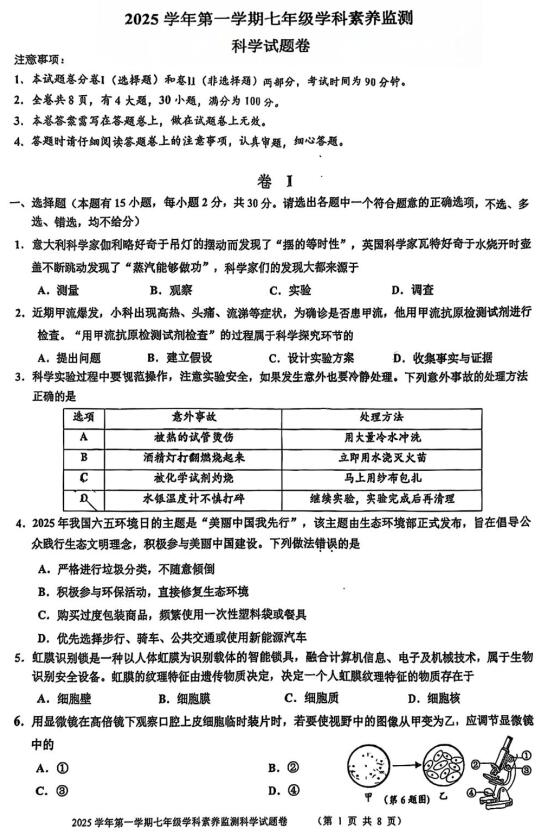 浙江省舟山市2025-2026学年七年级上学期期末科学试卷(扫描pdf版,无答案)