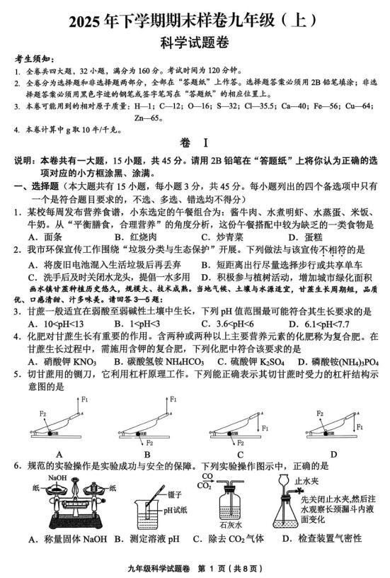 浙江省金华市2025年下学期期末样卷九年级(上) 科学试题卷(扫描PDF版,无答案)