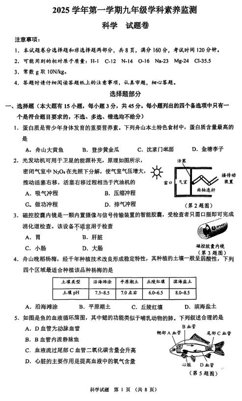 浙江省舟山市2025-2026学年1月九年级上学期期末科学试卷(扫描PDF含答案)