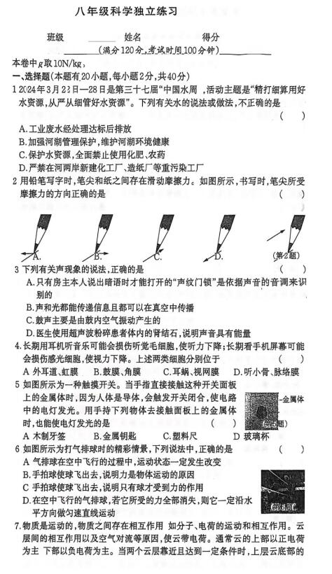 2026年浙江省杭州市西湖区杭州市公益中学八年级科学独立练习(扫描PDF版,无答案)