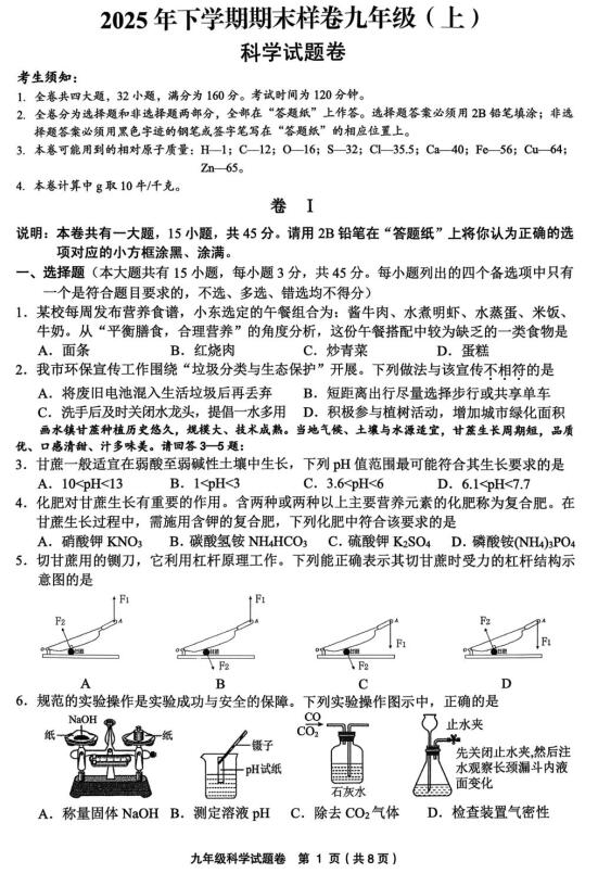 金华东阳市2025学年第一学期九上期末样卷(扫描附答案)