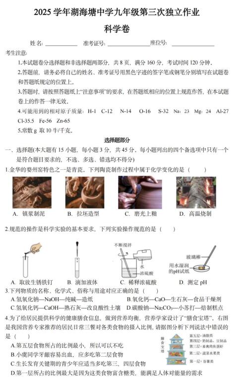 浙江省金华市2025学年湖海塘中学九年级第三次独立作业科学卷(扫描pdf版,无答案到九下第2章)