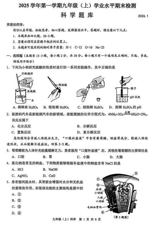 2026年1月浙江省温州市九年级上学期期末考试科学试题(扫描无答案)