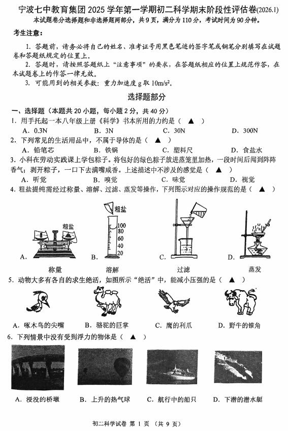 浙江省宁波七中教育集团2025学年第一学期初二科学期末阶段性评估卷(扫描PDF版 无答案)