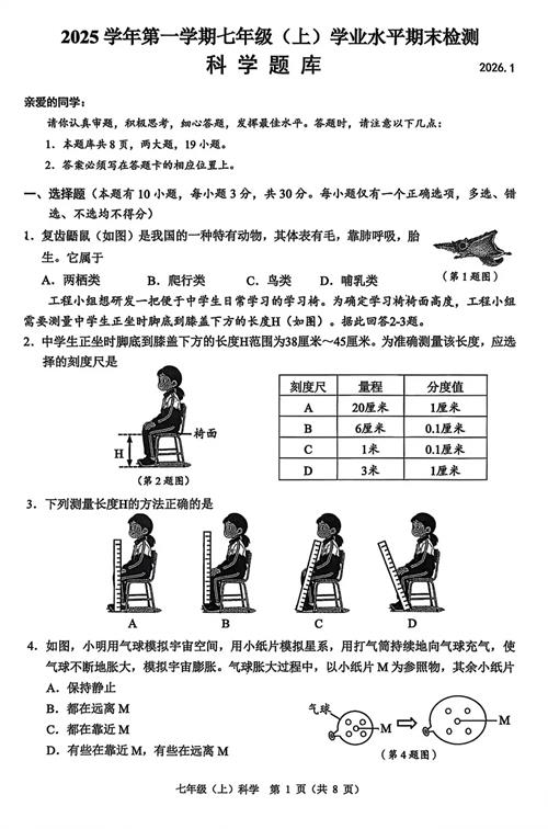 2026年1月温州市七上科学期末卷试题(扫描附答案)