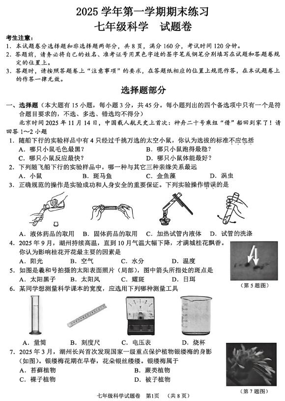 浙江省湖州市长兴县(南浔区、安吉县)2025学年第一学期期末练习七年级科学 试题卷(扫描PDF版,无答案)