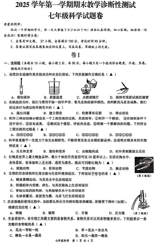 浙江省温州市苍南县2025学年第一学期期末教学诊断性测试 七年级科学试题卷(扫描PDF版,含答案)