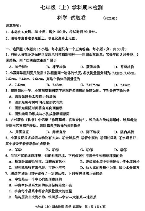 嘉兴市2025-2026学年第一学期七年级上学科期末检测试题(扫描附答案)