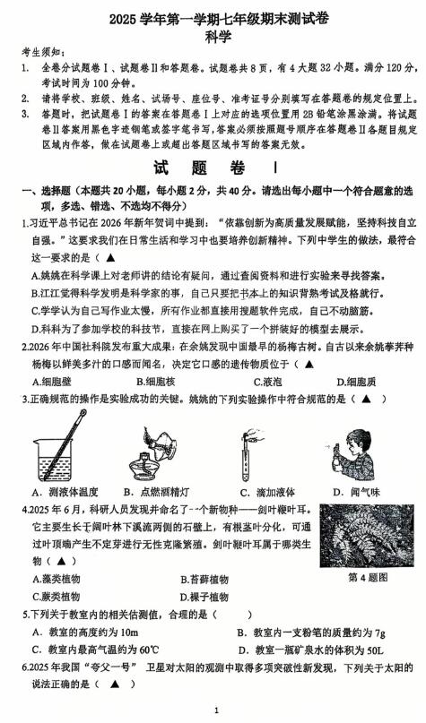 浙江省宁波市余姚市2025学年第一学期七年级期末测试卷 科学(扫描PDF版,无答案)