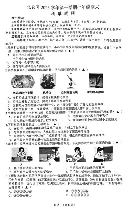 浙江省宁波市北仑区2025学年第一学期七年级期末 科学试题(扫描PDF版,无答案)