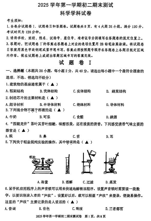 浙江省宁波市慈溪市2025学年第一学期初二期末测试 科学学科试卷(扫描PDF版,无答案)