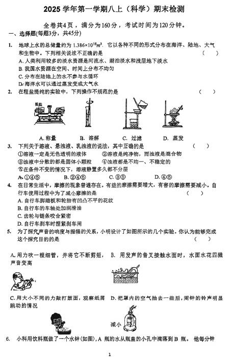 浙江省宁波市北仑区精准联盟2025学年第一学期八上(科学)期末检测(扫描PDF版,无答案)