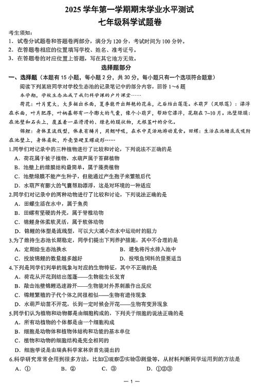杭州临平区2025学年第一学期七年级期末学业水平测试(扫描无答案)