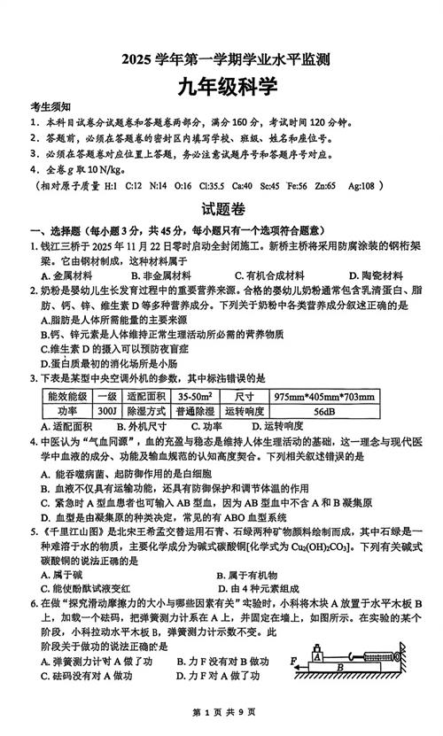 2025学年第一学期杭州市上城区九上学业水平监测(扫描无答案)