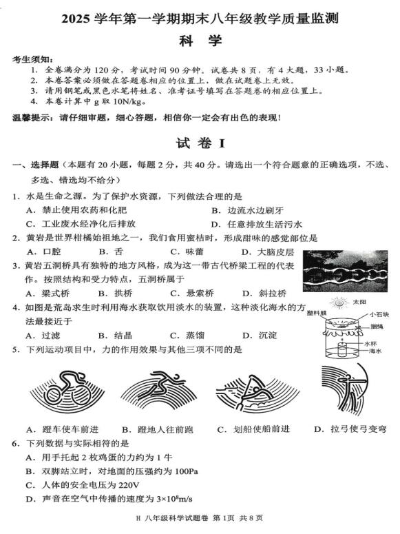 浙江省台州市黄岩区2025学年第一学期期末八年级教学质量监测 科学(扫描PDF版,含答案)