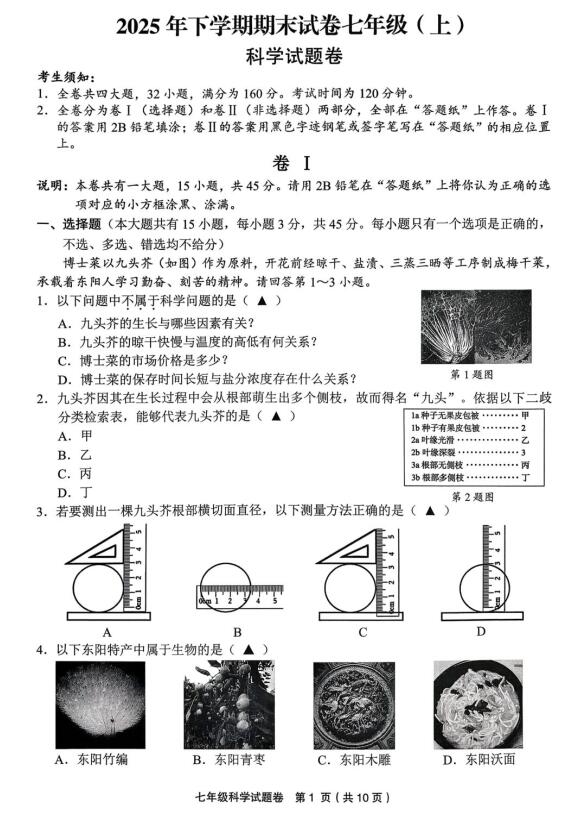 浙江省金华市东阳市2025年下学期期末试卷七年级(上) 科学试题卷(扫描PDF版,含答案)