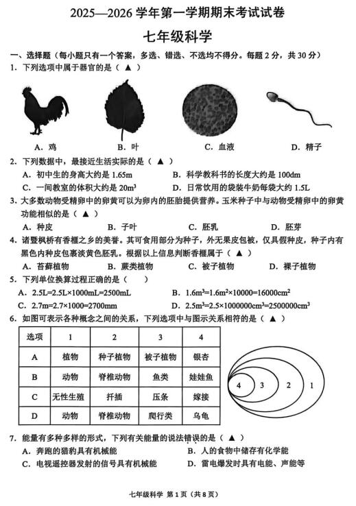浙江省绍兴市诸暨市2025一2026学年第一学期期末考试试卷 七年级科学(扫描PDF版,含答案)