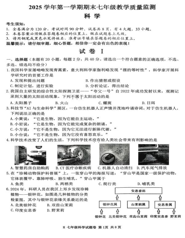 浙江省台州市黄岩区2025学年第一学期期末七年级教学质量监测 科学(扫描PDF版,含答案)