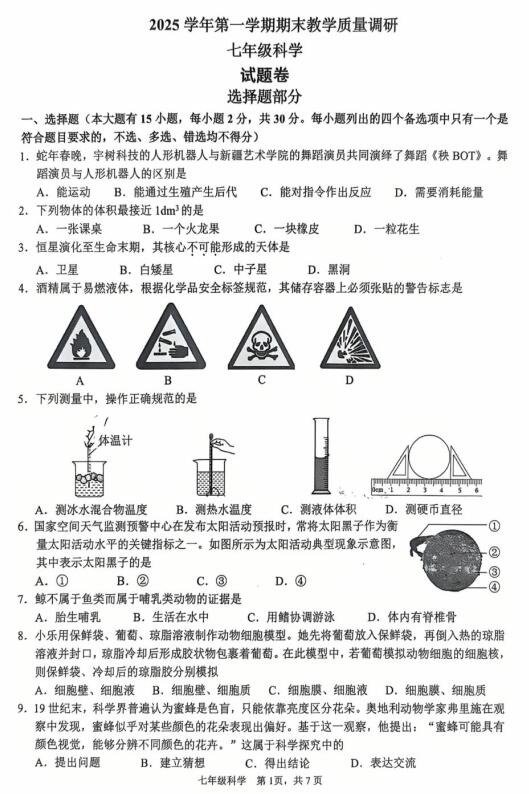 浙江杭州市拱墅区2025学年第一学期期末教学质量调研 七年级科学试题卷(扫描PDF版,附答案)