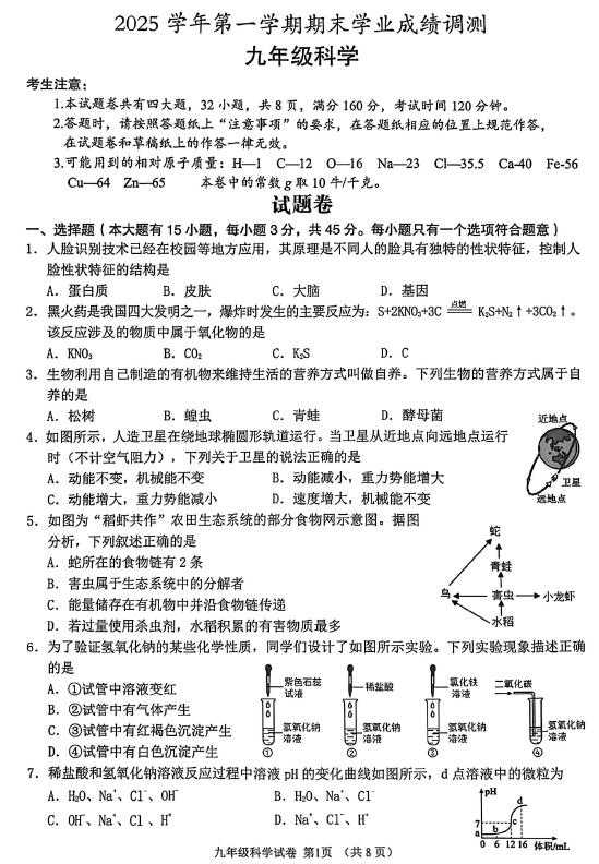 浙江省绍兴市嵊州市2025学年第一学期期末学业成绩调测九年级科学试卷(扫描PDF版,无答案)