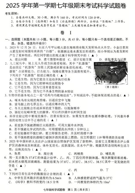 浙江省金华市永康市2025学年第一学期七年级期末考试科学试题卷(扫描PDF版,含答案)