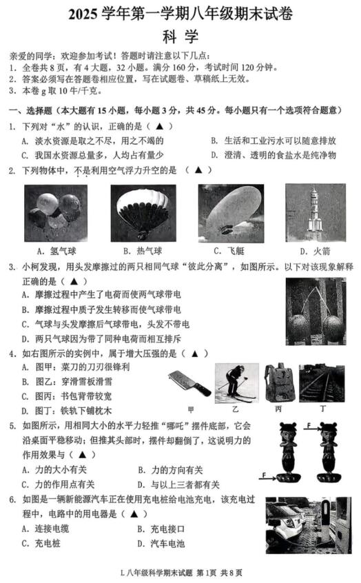 浙江省台州市路桥区2025学年第一学期八年级期末试卷 科学(扫描PDF版,含答案)