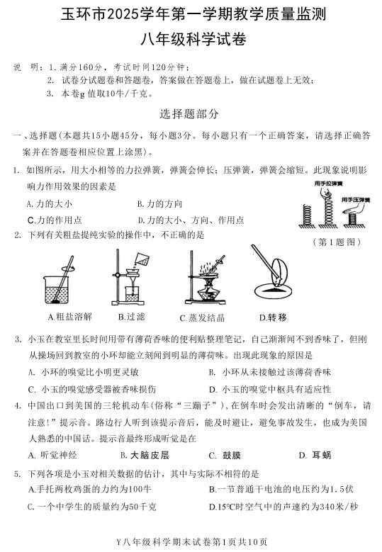 浙江省台州市玉环市2025学年第一学期教学质量监测 八年级科学试卷(扫描PDF版,无答案)
