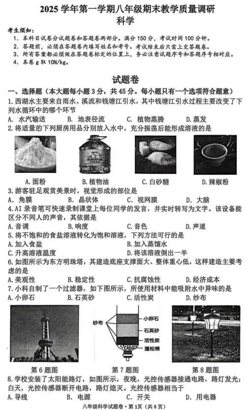 2025学年第一学期杭州西湖区八年级期末科学卷(扫描无答案)