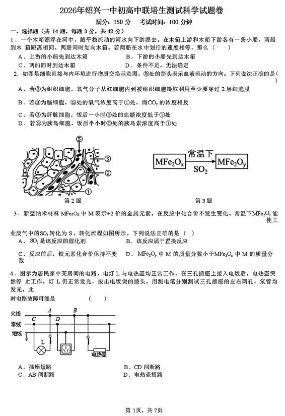 2026年浙江省绍兴一中初高中联培测试科学试题(扫描附解析)