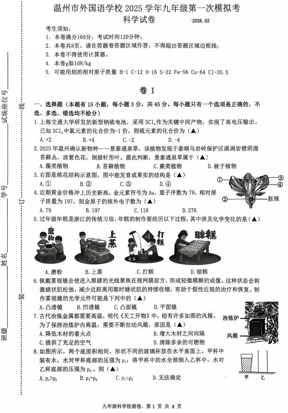 2026年3月浙江省温州外国语学校中考一模科学试题(扫描附答案)